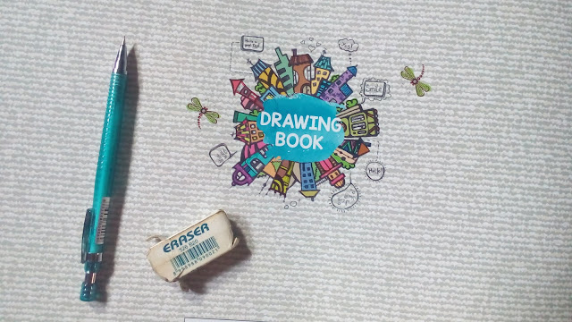di gambar atas saya menggunakan buku gambar ukuran A3, kemudian pensil dan penghapus yang bisa dilihat dengan harga murah.